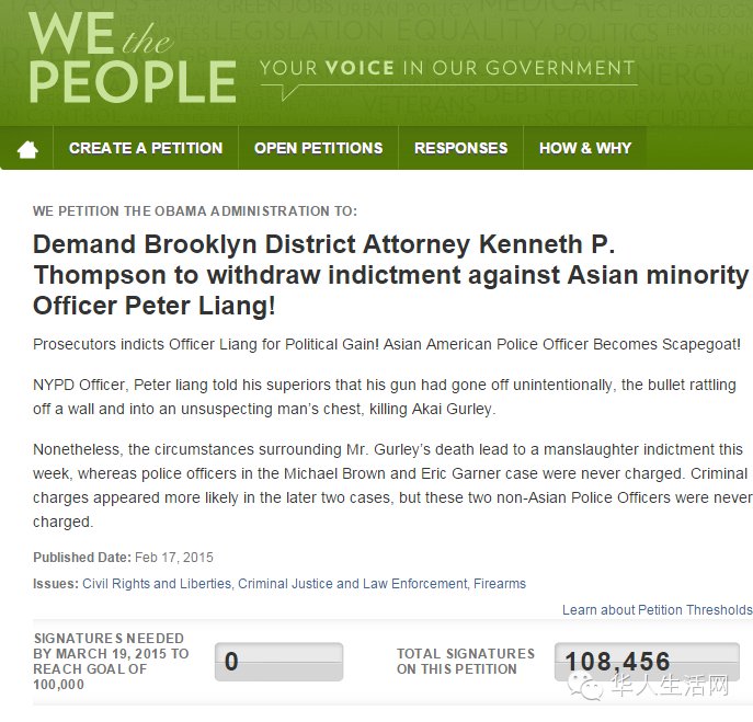 布鲁克林法官撤回对梁彼德警官的二级误杀控罪。谢谢我们众志成诚。 现在已经11万2千多了 Demand Brooklyn District Attorney Kenneth P. Thompson to withdraw indictment against Asian minority Officer Peter Liang! https://petitions.whitehouse.gov/petition/demand-brooklyn-district-attorney-kenneth-p-thompson-withdraw-indictment-against-asian-minority/G26sxfMP 新闻回顾: 一夜之间,白宫请愿越顶十万,近5百万人转发阅读,速度之快,完全出乎我的意料。 《万众一心!呼声震天,绝不做替死鬼!白宫大请愿,百万华人凝聚时刻又现》是早晨8点多发出,这篇文章虽然不长,但是我是前天晚上10点下班后,到早晨5点才整理出来。 昨天晚上,下班后就看见好多朋友在微信圈,不停的转发白宫的请愿的增涨数字的截图。 此文有点“标题党”我是学理科没有办法,请见谅。这次请愿,海内外各主媒体都没有人替我们呐喊,我们真正需要感谢的是我们自己,还有周边朋友的传播。 作为华人生活网的平台创建人,我要感谢的是关注咱们平台的每一个朋友!在这里我向您说一声:“过年好,谢谢您,感谢您的一路相伴!” 无论你人在国内,还是海外,因为我们每一个人都一颗民族心,在受到委屈时,遇到困难时候,才能真正体现出,我们是一家人来。 关于帮梁警官的一些指南,尤其外地朋友看一下,尽量去主流媒体, comment如下列关于梁警官的新闻 1) Killer or Sacrificial Lamb: Maybe Both http://nypdconfidential.com/columns/2015/150216.html?nsukey=YiHOX%2FMGO1mvc0XABwS46d3AaHaHLFB2%2BcDsRr5yDnP1NbfDYO4izIAZUyrYjkXmuOlciEE7OtXioU2S7A3v0A%3D%3D 2) NYTimes:老外们一眼看出梁警官是替罪羊!http://mobile.nytimes.com/comments/2015/02/11/nyregion/akai-gurley-shooting-death-officer-indicted.html 3)这个Video很多comments: http://www.worldstarhiphop.com/videos/video.php?v=wshhB6aiuW3r5vzMF5H8 关于误杀法律依据及注意须知: 美国警察执行任务时危险情况下误杀不起诉的法律依据是1989美国最高法院的Graham v Connor判例,http://en.m.wikipedia.org/wiki/Graham_v._Connor这 是Ferguson的BrownCase和纽约的GarnerCase最后被判定不起诉的宪法依据。华人警官Liang的Case要比 GarnerCase轻很多,如果按照以前的两个判例的法律依据以及Graham v Connor判例形成的宪法基础,如果没有政治考量,华人警官Liang绝对不应被起诉。所以签名绝对没有违背良心。(George Yang:这个不绝对。Oakland 的 Oscar Grant 案子就判了刑。所以我从来不说"白人警察不判".) 梁警员律师费由警察工会支付,不需要社会捐助;千万不要让不怀好心之人骗了。目前为止,没听说粱家需要捐款的消息。梁警官作为工会成员,所有律师费会由工会出。梁警官现在的律师是警察工会提供的律师,Stephen Worth http://www.wll-law.com/attorneys/stephen-c-worth/, 据了解他应该比较有代表警察打刑事官司的经验。请不久Eric Garner"I can't breath"的案子,就是这个律师的另一个合伙人代表的那个案子里的警察。梁警官的华人支持者也在和梁家沟通,向他们说明不一定非要用警察工会提供的律 师,并向他们推荐其它律师。这个最终要由梁家自己决定。 |
