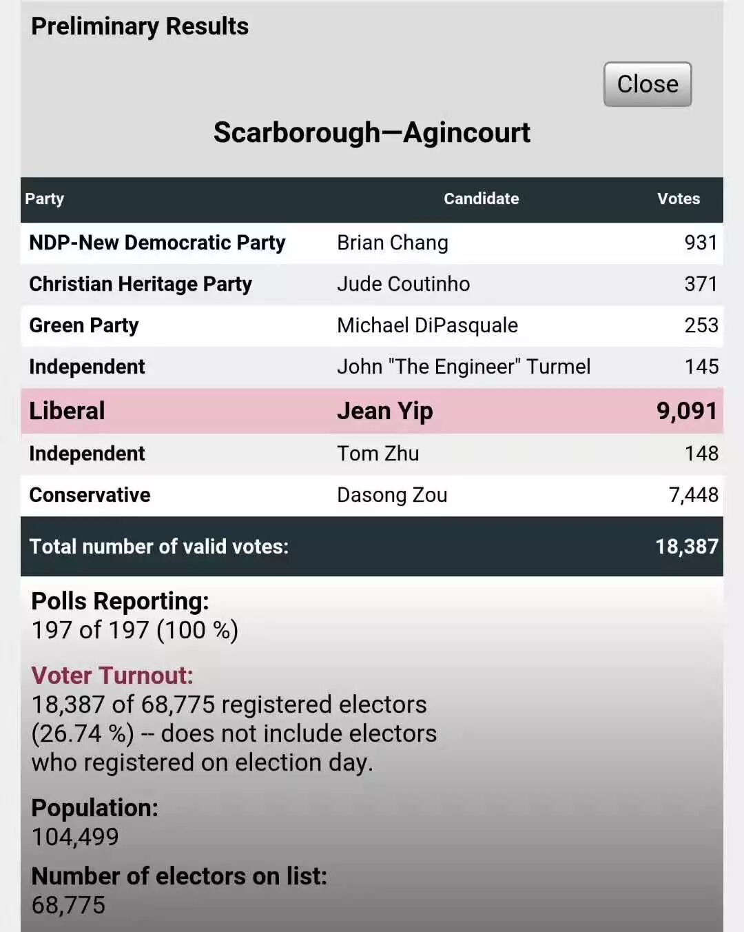 在刚刚结束联邦4个选区的补选中,加拿大自由党赢得了3个议席、比补选前增加了一个席位,其中在不列颠哥伦比亚省的一个议席是从保守党手里夺过来的;赢得该席位的是Gordie Hogg,他获得了47.5%的选票,其保守党对手的得票率是42.1%。 加广版权所有www.rcinet.ca微信:radio-canada 自由党保住的两个联邦议会议席一个是从政坛隐退的前内阁部长Judy Foote在纽芬兰省Bonavista–Burin–Trinity的选区,获胜者是 Churence Rogers,得票率69%。 保守党保住了其在萨斯喀彻温省Battlefords-Lloydminster选区的席位,获胜者Rosemarie Falk的得票率是69.6%。 加广版权所有www.rcinet.ca微信:radio-canada 保守党领袖谢尔上任后保守党已经连续两次在联邦选区补选中失掉了席位。 克难奋进,续写政坛佳话 病故华裔议员遗孀叶嘉丽胜出 在备受关注的士嘉堡爱静阁选区联邦补选中,代表自由党出战的华裔候选人、陈家诺的遗孀叶嘉丽(Jean Yip)以49.4%的得票率击败获40.5%选票的保守党候选人邹大松(Dasong Zou),当选士嘉堡爱静阁选区联邦国会议员。从名字看,似乎还有两名华裔参选,即新民主党候选人Brian Chang,得票5.1%,独立候选人Tom Zhu,得票0.8%。据Elections.ca网页,该区总人口104,499,有资格投票人68,775,当日投票人18,387,比例仅为26.74% 叶嘉丽发表获胜感言,向竞选团队和所有支持者表示感谢,“我很荣幸也很谦卑,能在渥太华代表你们,我很高兴加入特鲁多团队继续为壮大中产阶级做出努力,我期待能做出成绩。” 叶女士表示,若陈家诺再天有灵,一定会热爱这场补选,而且为她的获胜而感到骄傲。这场补选,将陈家诺所有的朋友——无论是联邦的、安省的、自由党内的,以及没有任何政治背景的人——联合起来。 最后,她说“从那些虽失去了伴侣或是单身父母但依然前行、追寻自己梦想的人们那里获得了鼓舞。我感激你们给了我如此大的支持。非常感谢!” 她还承诺,在当选之后不会远离选区的居民,“还去一家家的敲门,聆听民众的需要”。 傲雪寒梅别样红 冰洁品高暗香来 与陈家诺携手19年的婚姻生活,Jean开玩笑说"她总觉得他对政治的热爱更超过爱她",不过她还是相当理解并支持他的政治事业。叶嘉丽过去两年活跃在士嘉堡爱静阁区,尤其在陈家诺患病期间,她更是走入社区、深入选民,切实地体察民情与选取诉求。 叶嘉丽五个重点施政方向