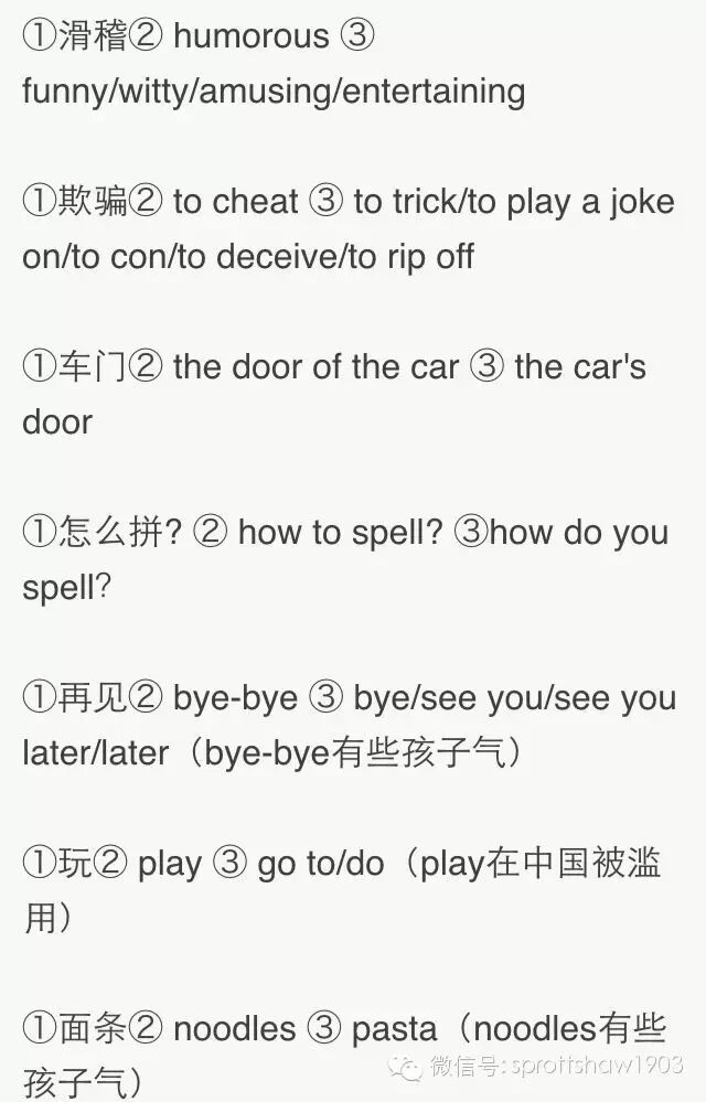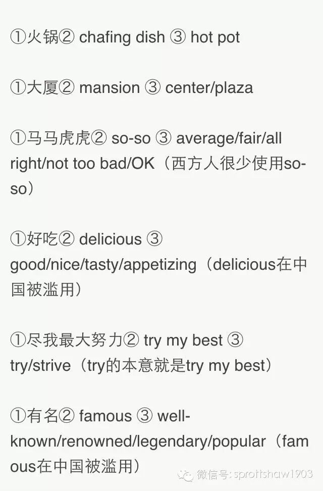 在各个英语学习论坛上,经常可以看到有关Chinglish(中式英语)的文章,但一般都是中国人写的。不过我看到过一篇长文,也是有关Chinglish的,但却是美国人写的,很有意思。 这篇长文的标题是Chinglish 2 English(从中式英语到标准英)作者是浙江大学的美国外教Chuck Allanson,内容则是Chuck在中国五年任教期间所听到、所看到的各种Chinglish说法。 比如Chuck第一次来中国,下飞机后,负责接待他的东北某大学英语系陈老师说:您刚到,我们吃点饭吧。我们要点Chinese dumpling(饺子)和Chinese beancurd(豆腐),您看可以吗? Chuck以前从未听说过这两种东西,但出于好奇,就说可以,结果饭菜端上来一看,原来就是ravioli(饺子,来自意大利语)和tofu(豆腐,来自日语) Chuck当时心里暗想,这两种东西,国际上早已经有通用的说法(ravioli和tofu),他们中国人为什么还要用那种生僻的说法呢 以后Chuck跟陈先生混熟了,就问他,当初你为什么不说ravioli和tofu呢?陈先生听了大吃一惊,连忙解释说,我真的不知道这两个词,而且我们的《英汉词典》上也没有这两个词 于是Chuck开始意识到,中国的英语教师、英语课本、甚至英语词典肯定存在问题,否则不可能发生这种事情。 在中国五年的任教期间,Chuck收集了大量的Chinglish说法,从中挑选出一组最常见的,编写了上面提到的那篇长文 下面就是这些Chinglish说法,其中每行第一部分是汉语说法,第二部分是Chinglish说法,第三部分则是英语的标准说法