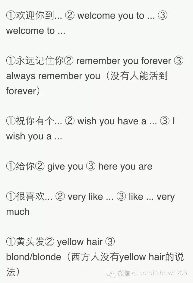 1.这个价格对我挺合适的。 误:The price is very suitable for me. 正:The price is right. 提示:suitable(合适的、相配的)最常见的用法是以否定的形式出现在告示或通知上,如:下列节目儿童不宜。The following programme is not suitable for children. 这句话用后面的说法会更合适。 2.你是做什么工作的呢? 误:What's your job? 正:Are you working at the moment? What kind of work are you? 提示:what's your job这种说法难道也有毛病吗? 是 的。因为如果您的谈话对象刚刚失业,如此直接的问法会让对方有失面子,所以您要问:目前您是在上班吗?Are you working at the moment?接下来您才问:目前您在哪儿工作呢?Where are you working these days?或者您从事哪个行业呢?What line of work are you in? 3.用英语怎么说? 误:How to say? 正:How do you say this in English? 提示:How to say是在中国最为泛滥成灾的中国式英语之一,这绝不是地道的英语说法。 同样的句子有:请问这个词如何拼写?How do you spell that please?请问这个单词怎么读?How do you pronounce this word 4.明天我有事情要做。 误:I have something to do tomorrow. 正:I am tied up all day tomorrow. 提 示:用I have something to do来表示您很忙,这也完全是中国式的说法。因为每时每刻我们都有事情要做,躺在那里睡大觉也是事情。所以您可以说我很忙,脱不开身:I'm tied up.还有其他的说法:I can't make it at that time. I'd love to, but I can't, I have to stay at home. 5.我没有英文名。 误:I haven't English name. 正:I don't have an English name. 提示:许多人讲英语犯这样的错误,从语法角度来分析,可能是语法功底欠缺,因为have在这里是实义动词,而并不是在现在完成时里面那个没有意义的助动词。 所 以,这句话由肯定句变成否定句要加助动词。明白道理是一回事,习惯是另一回事,请您再说几话:我没有钱;I don't have any money.我没有兄弟姐妹;I don't have any brothers or sisters.我没有车。I don't have a car. 6.我想我不行。 误:I think I can't. 正:I don't think I can. 提示:汉语里说“我想我不会”的时候,英语里面总是说“我不认为我会”。以后您在说类似的英语句子的时候,只要留心,也会习惯英语的表达习惯的 7.我的舞也跳得不好。 误:I don't dance well too. 正:I am not a very good dancer either. 提示:当我们说不擅长做什么事情的时候,英语里面通常用not good at something,英语的思维甚至直接踊跃到:我不是一个好的舞者 8.现在几点钟了? 误:What time is it now? 正:What time is it, please? 提示:What time is it now是一个直接从汉语翻译过的句子,讲英语的时候没有必要说now,因为您不可能问what time was it yesterday, 或者what time is it tommorow? 所以符合英语习惯的说法是:请问现在几点了?还有一种说法是:How are we doing for time?这句话在有时间限制的时候特别合适 9.我的英语很糟糕。 误:My English is poor. 正:I am not 100% fluent, but at least I am improving. 提示:有人开玩笑说,全中国人最擅长的一句英文是:My English is poor. 外国人遇到自己外语不好的情况,他们会说: I am still having a few problem, but I am getting better. |